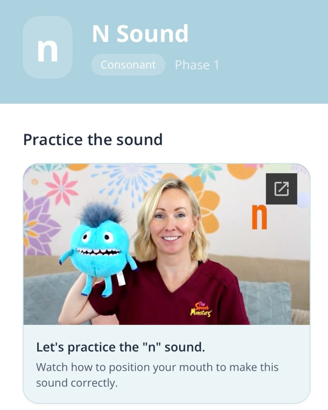 A coloured placement cue provides concrete guidance on where to place the tongue for production of some sounds.